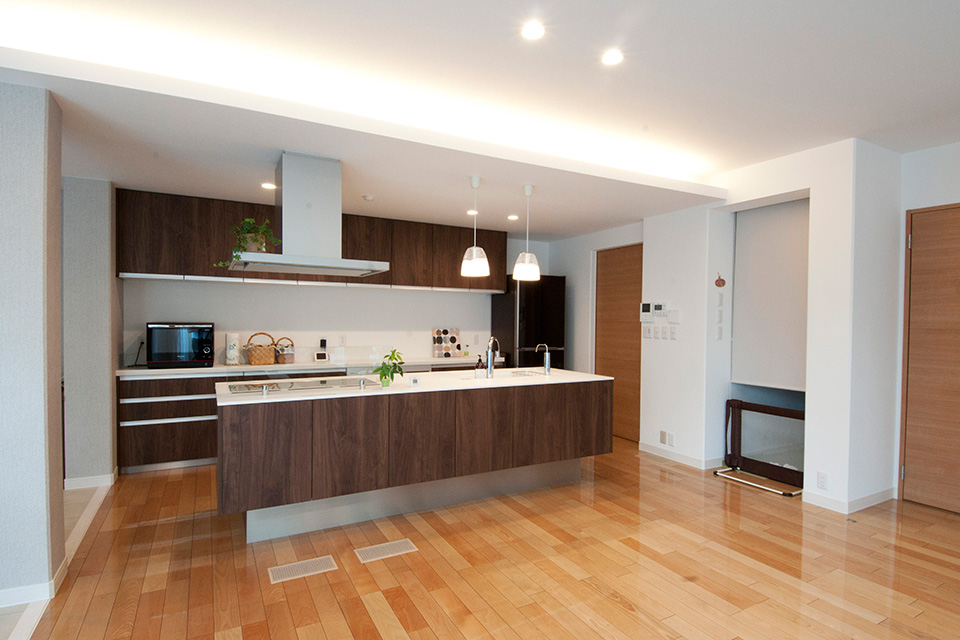 キッチンから、パントリー、サニタリー、浴室まで一直線に並ぶ家事動線は、「リビングからは見えずに移動できるのが便利で、掃除するのも苦ではなくなりました」と奥様も大満足。