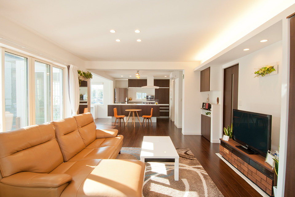 「明るい抜け感のある住まい」、これがI様の新居のメインテーマ。ご要望どおり、3面をガラス窓で囲まれたサンルームのようなパノラマ・コートと、同じくガラス窓で半円形に囲まれたボウウインドウのスペースをLDKに隣接させることで採光たっぷりの明るい大空間が完成しました。もうひとつのこだわりは収納。できるだけ生活感が出ないように、玄関収納、寝室のウォークインクローゼット、屋根裏スペースと3つの大型収納を設けました。おかげで小さなお子様がいると思えないほど、いつも室内はすっきり。子育てと家事を両立し、さらに楽しめるような住まいになりました。