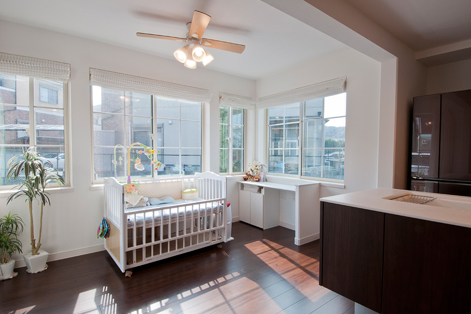 パノラマ・コートに置かれたベビーベッドは、お子様の特等席です。「将来は、庭に石窯を作って、この空間でパン屋さんをオープンしたいんです」と奥様の夢も広がります。