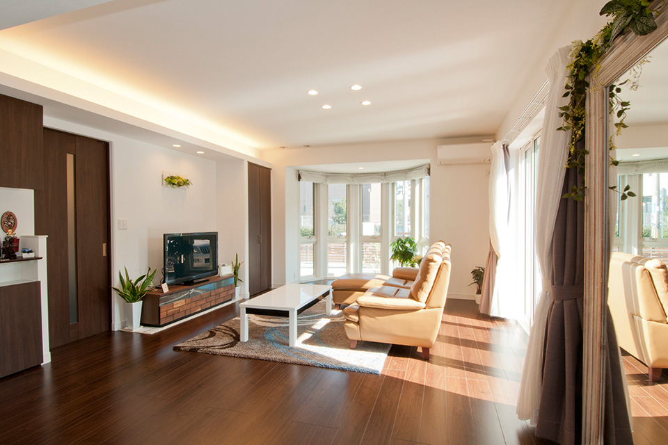 昼間は、リビングの奥の半円形にガラス窓で囲まれたボウウインドウから柔らかな光がたっぷり降り注ぎます。夜、室内を美しく照らすのは、ご主人のお気に入りのコーブ照明。