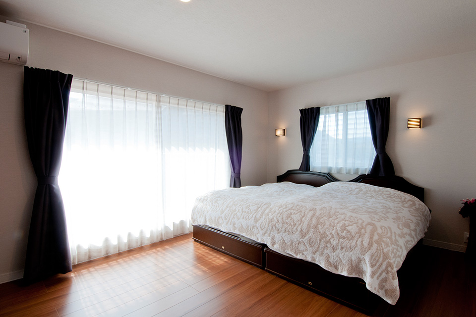 ご主人こだわりの、ホテルライクな寝室。ベッド上の照明がラグジュアリー感を演出しています。こちらは奥様のチョイス。
