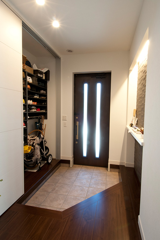 玄関の壁一面を大型のクローゼットに。「おかげで大量の靴とベビーカー、コート類も全部納まりました」とI様。たっぷりの収納は、生活感を出さない工夫です。