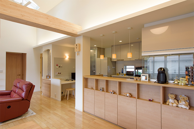 子世帯のキッチンには、リビング収納を兼ねる家具調のカウンター付きキッチンを選びました。「整理整頓がしやすい」とお料理が大好きな奥様も納得。カウンターのディスプレイコーナーには、お子さんのおもちゃなどを飾って。