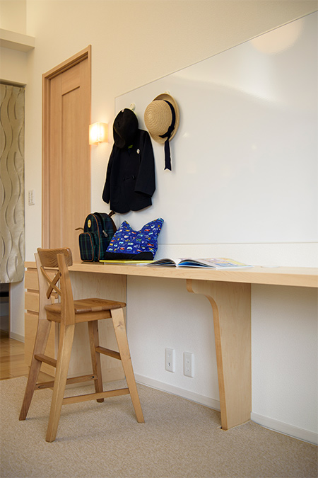 子世帯ダイニングの一角には、まだ小さいお子さんの勉強コーナーに、カウンターデスクとホワイトボードを設置。「遊びも、お勉強も、お片付けもすべてここで」とT様。キッチンからも目が届いて安心です。
