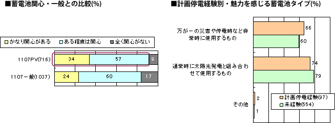 今回の震災では、停電がクローズアップされ、注目されたのが蓄電池です。PV採用者で34%(ある程度関心を含めると91%)、一般で24%(同84%)が蓄電池に高い関心を示しています。