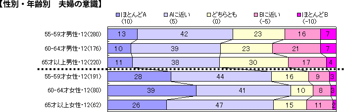 「夫婦といえども1人の時間が欲しい、それでこそ仲良く暮らせる(A)」については、「ほとんどA」18%、「Aに近い」41%で、合わせて59%が考え方を支持しています。2007年との比較で見ると割合に変化はなく、この年代では当たり前の意識として定着している様子が伺えます。