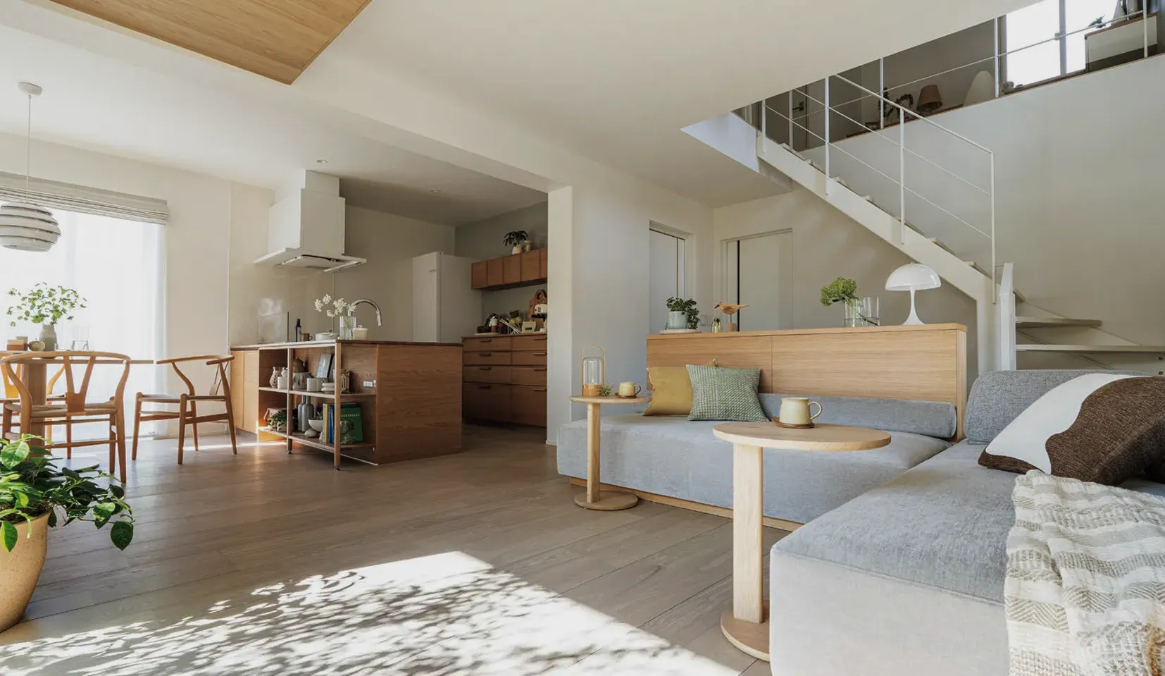 リビングとダイニングキッチンが、近すぎず遠すぎない距離感でつながるLDK。家族それぞれの時間も、一緒に過ごす時間も大切にできる空間です。南面の大開口から光と風を招き、明るく開放的な心地よさを生み出します。