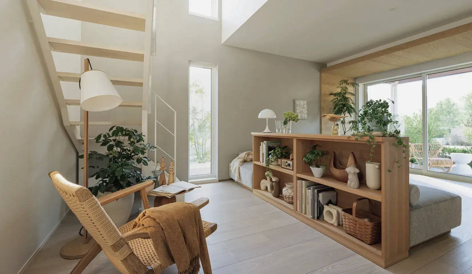 縦に視線が抜ける吹き抜けとオープン階段の下に設えた読書コーナー。東面の窓から差し込む朝陽に包まれながら、お気に入りのチェアで本を読む、朝の習慣。向かいの書棚から次の一冊を選ぶ、静かで満ち足りた時間が流れます。