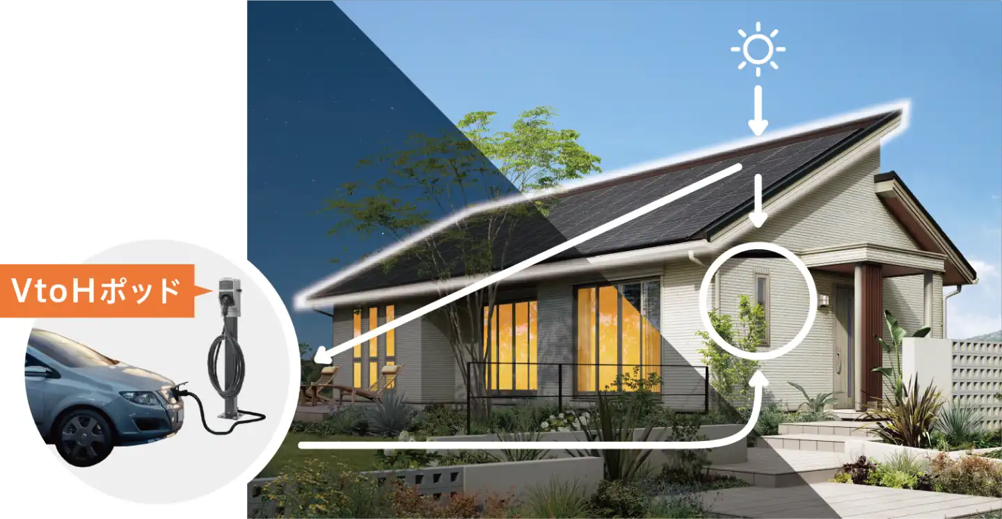 家と電気自動車をつなぐことで、自家発電した電力を電気自動車で活用することができるシステムです。自宅に接続している時間は、大容量の蓄電池としても活用することが可能。環境配慮と安心、さらに経済性も高まります。