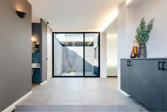中庭のシンボルツリーがアイキャッチとなる玄関。開放感をもたらします。
