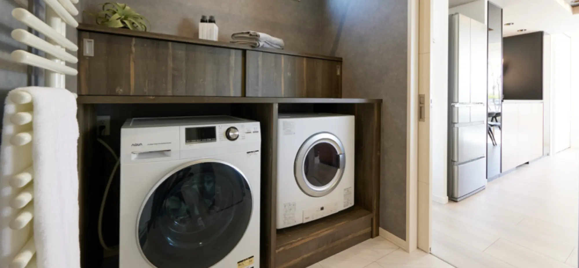 キッチンから水まわりや個室、玄関横の納戸へと回遊できる動線を設けました。動線上に収納を配置することで、片づけがしやすく、リビングがすっきりと保てます。