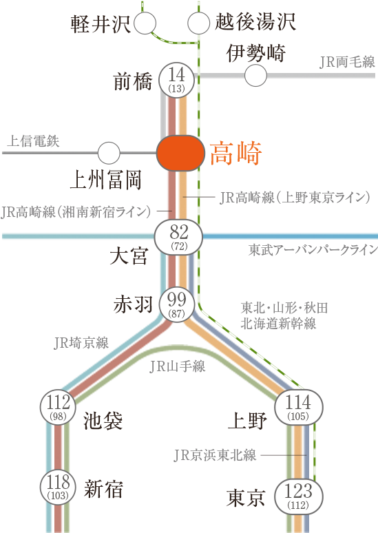 「前橋」駅へ14分、「大宮」駅や「東京」駅へもダイレクト。JR湘南新宿ライン、JR上野東京ラインが利用でき、在来線でもスムーズなアクセスを誇ります。通勤や通学、お出かけも軽快です。
