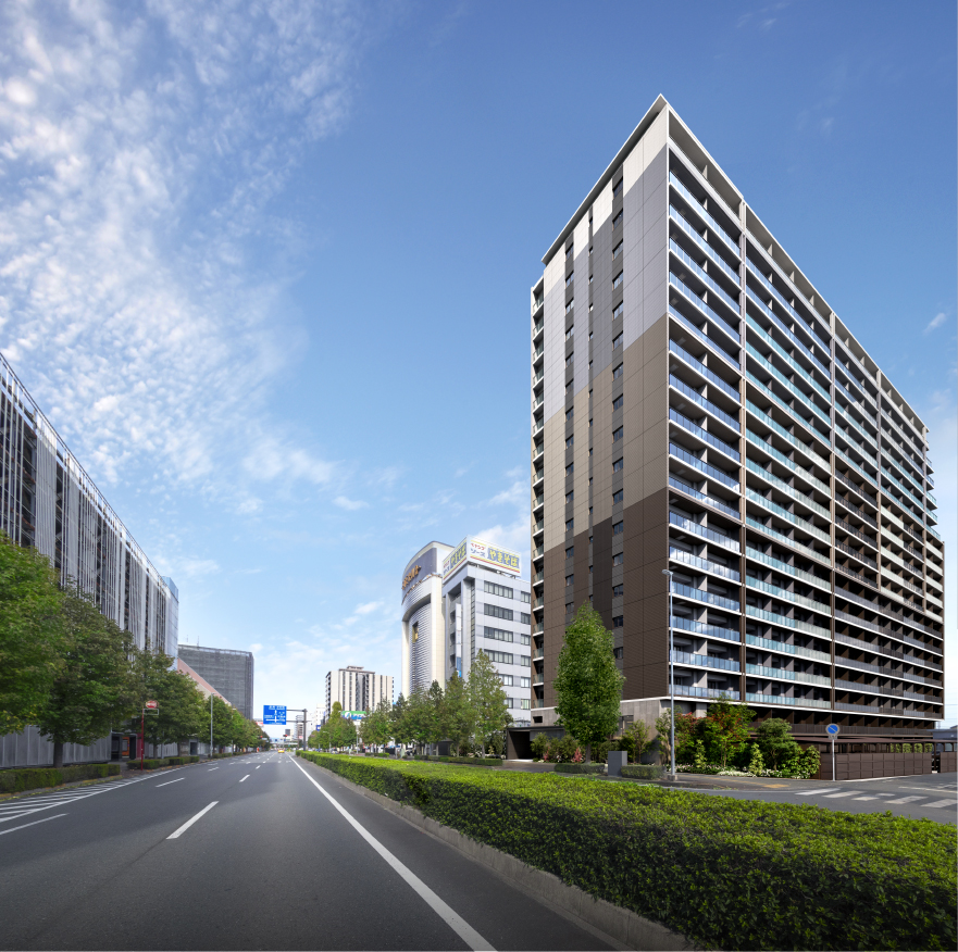 外観完成予想CG 掲載の外観完成予想CGは計画段階の図面をもとに描いたCGと現地周辺で撮影した写真(2024年11月撮影)を合成したもので、実際とは異なります。尚、植栽は実際に植樹する樹形、枝ぶり、葉や花の色合いとは異なる場合があり、特定の季節の状況を示すものではありません。また、竣工時には完成予想CG程度には成長しておりません。予めご了承ください。施工上やむをえない変更が生じた場合は建物竣工時の状態を優先します。家具・調度品・備品などは販売価格には含まれておりません。