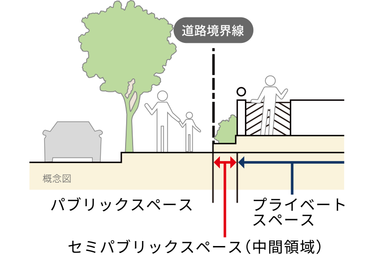 ※掲載のまちなみ概念図、正面図は計画段階の図面をもとに描き起こしたもので実際とは異なります。尚、植栽は実際に植樹する樹形、枝ぶり、葉や花の色合いとは異なる場合があり、特定の季節の状況を示すものではありません。