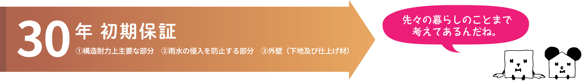【30年保証に関する注意事項】※保証の期間や内容は対象部位、商品、建築地により異なる場合があります。詳細については保証基準をご覧頂くか担当営業へお問合せください。※ドマーニイ準耐仕様、グランツーユーV、賃貸住宅、賃貸併用住宅は30年保証制度の対象外となります。※建築地が北海道の場合は保証期間が異なります。※外壁について、機能上影響のない反りや軽微なひび割れは保証の適用外となります。※磁器タイル外壁以外の外壁(下地及び仕上材)の保証期間は10年間になります。※30年保証制度の適用を受けるためには、保証書のアフターサービス基準に則り、お引渡し後3回の定期点検及び25年目迄の5年ごとの定期診断をお受け頂くことが条件となります。ただし、当該点検、又は診断の結果、メンテナンスが必要と判断された場合は必要なメンテナンス工事を実施していただきます。※保証対象以外のメンテナンス工事は有償となります。