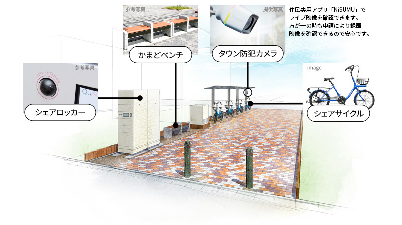 ※掲載のイメージイラストは、計画段階の図面を基に描き起こしたもので実際とは異なります。施工上やむをえない変更が生じた場合は建物竣工時の状態を優先します。※参考写真は実際に設置されているものとは異なります。※歩行者専用道路に設置されているシェアロッカーは戸建住人専用/マンション内に設置されているシェアロッカーはマンション住人専用となります。※マンション内に設置されているシェアサイクルはマンション住人専用となります。