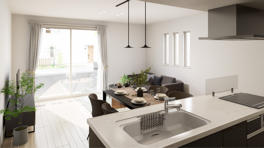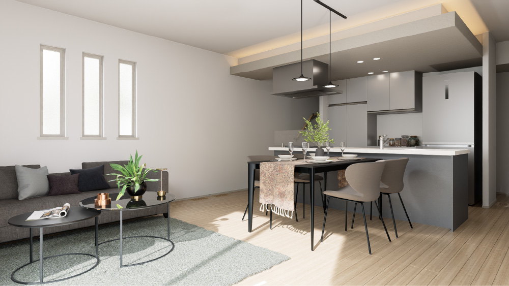 ※掲載の完成予想CGは、計画段階の図面を基に描き起こしたもので実際とは異なります。尚、植栽は実際に植樹する樹形、枝ぶり、葉や花の色合いとは異なる場合があり、特定の季節の状況を示すものではありません。竣工時には完成予想CG程度には成長しておりません。予めご了承ください。施工上やむをえない変更が生じた場合は建物竣工時の状態を優先します。販売価格に家具・照明・調度品・エアコン・備品・車等は含まれておりません。