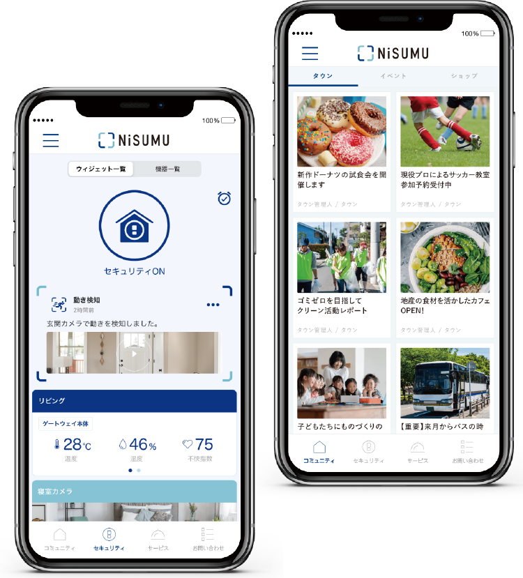「NiSUMU(ニスム)」は、まち・暮らし・人をつなぎ、サポートするために株式会社Secualと共同開発したスマートタウン向け総合サービスです。