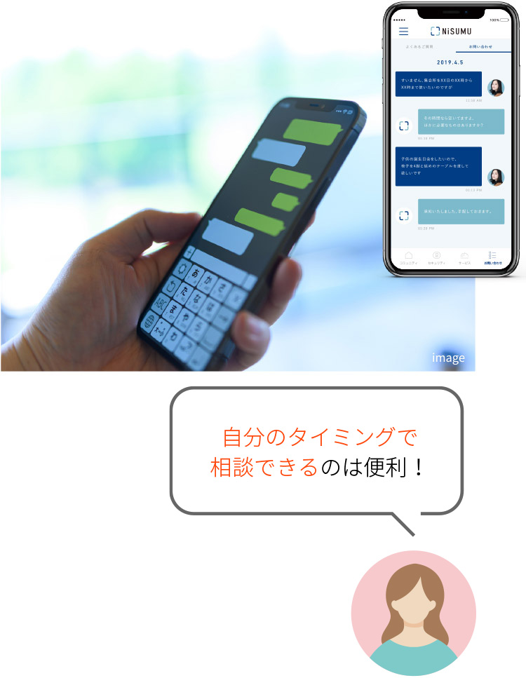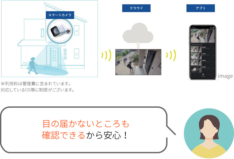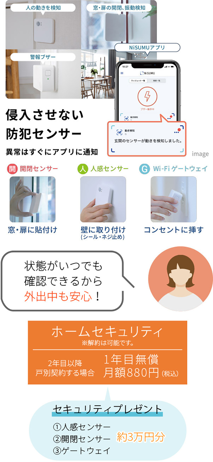 ※「NiSUMU(ニスム)」/株式会社Secualと積水化学工業株式会社が共同開発したスマートタウン向け統合サービス。別途各自で各種設定が必要となります。対応しているOS等に制限がございます。 本サービスは、未導入の物件もございます。※4:掲載内容はイメージです。画面のデザイン、仕様は予告なく変更する場合がありますのでご了承ください。
